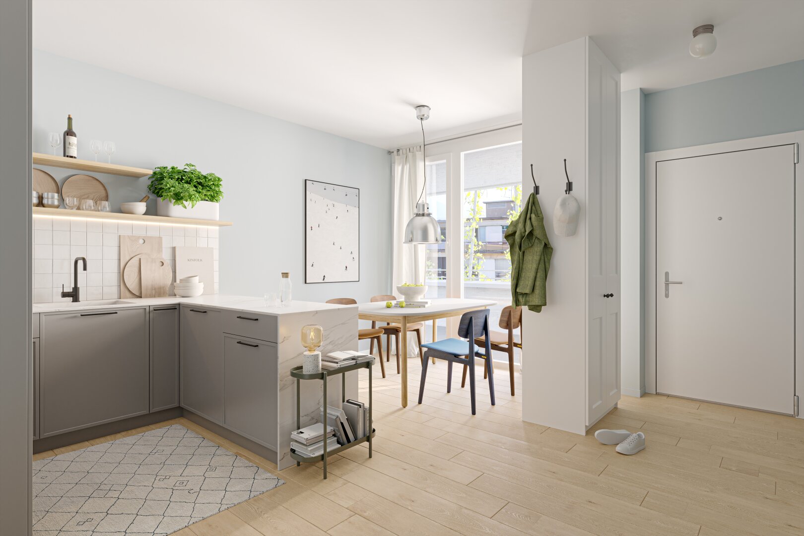 DAS PROJEKT zeichnet sich durch seine baulichen Besonderheiten und offene Grundrisse mit lichtdurchfluteten Wohnräumen aus. Raumhohe Verglasungen bringen viel Tageslicht in die Wohnküchen, während überdachte Loggien einen geschützten Außenbereich bieten, der ganzjährig zum Verweilen einlädt.