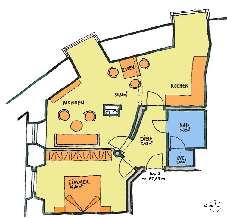 Die Wohnung verfügt über 57,59 m² Wohnfläche, einen geräumigen Vorraum, ein gemütliches Schlafzimmer, einen großzügigen Wohnraum samt hochwertiger Einbauküche, Bad mit Dusche und separatem WC sowie diverse historische und einzigartige Details.