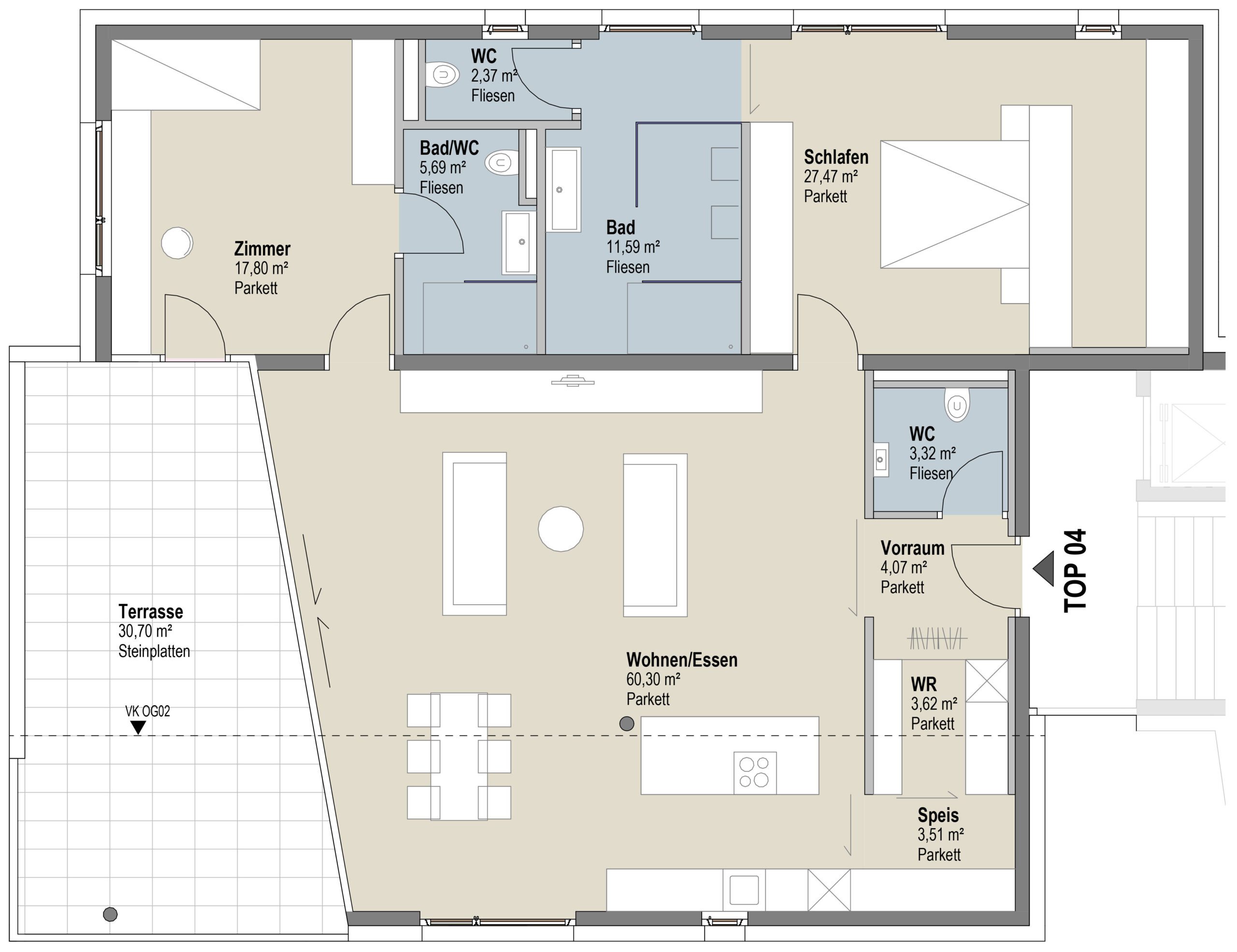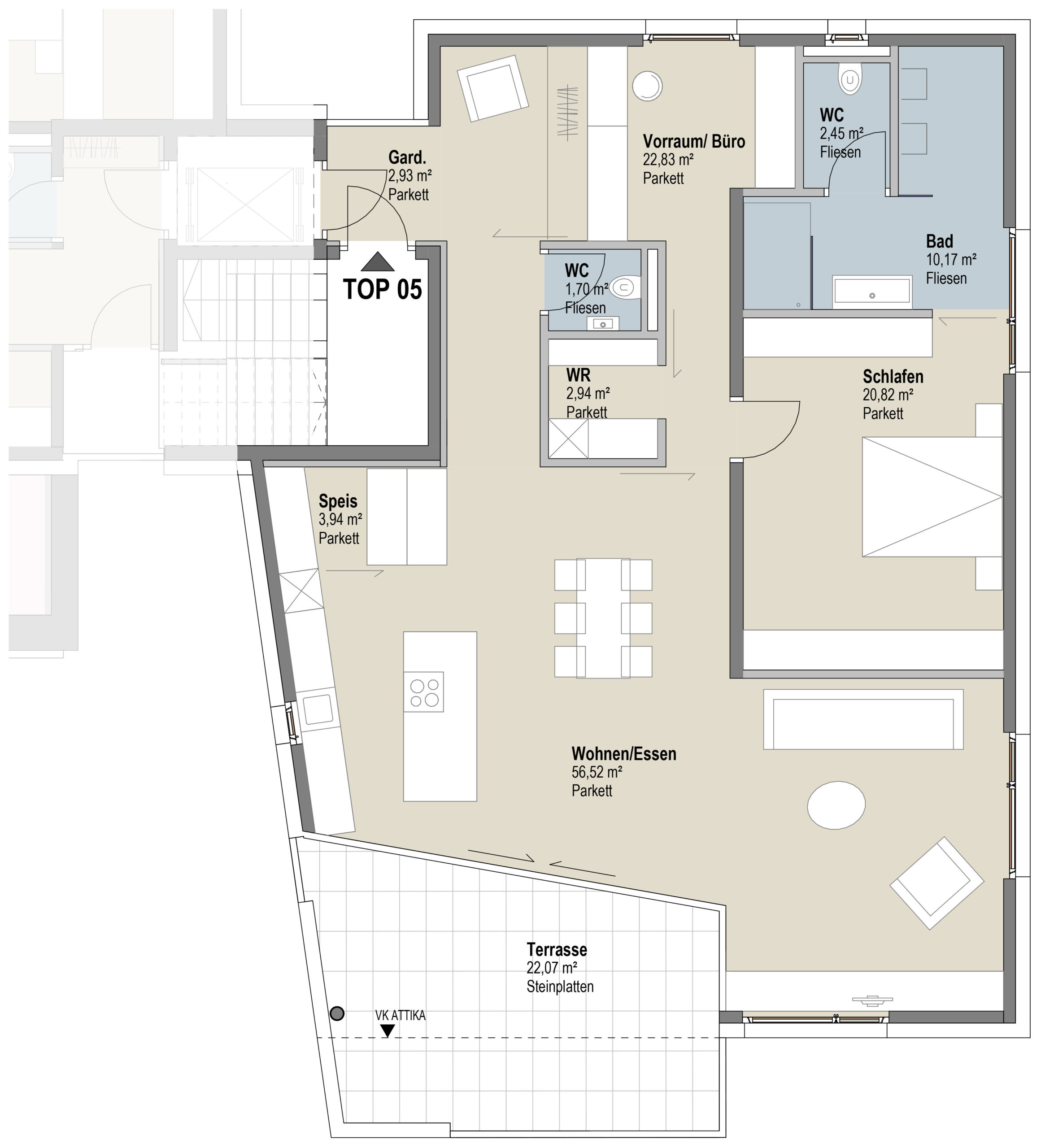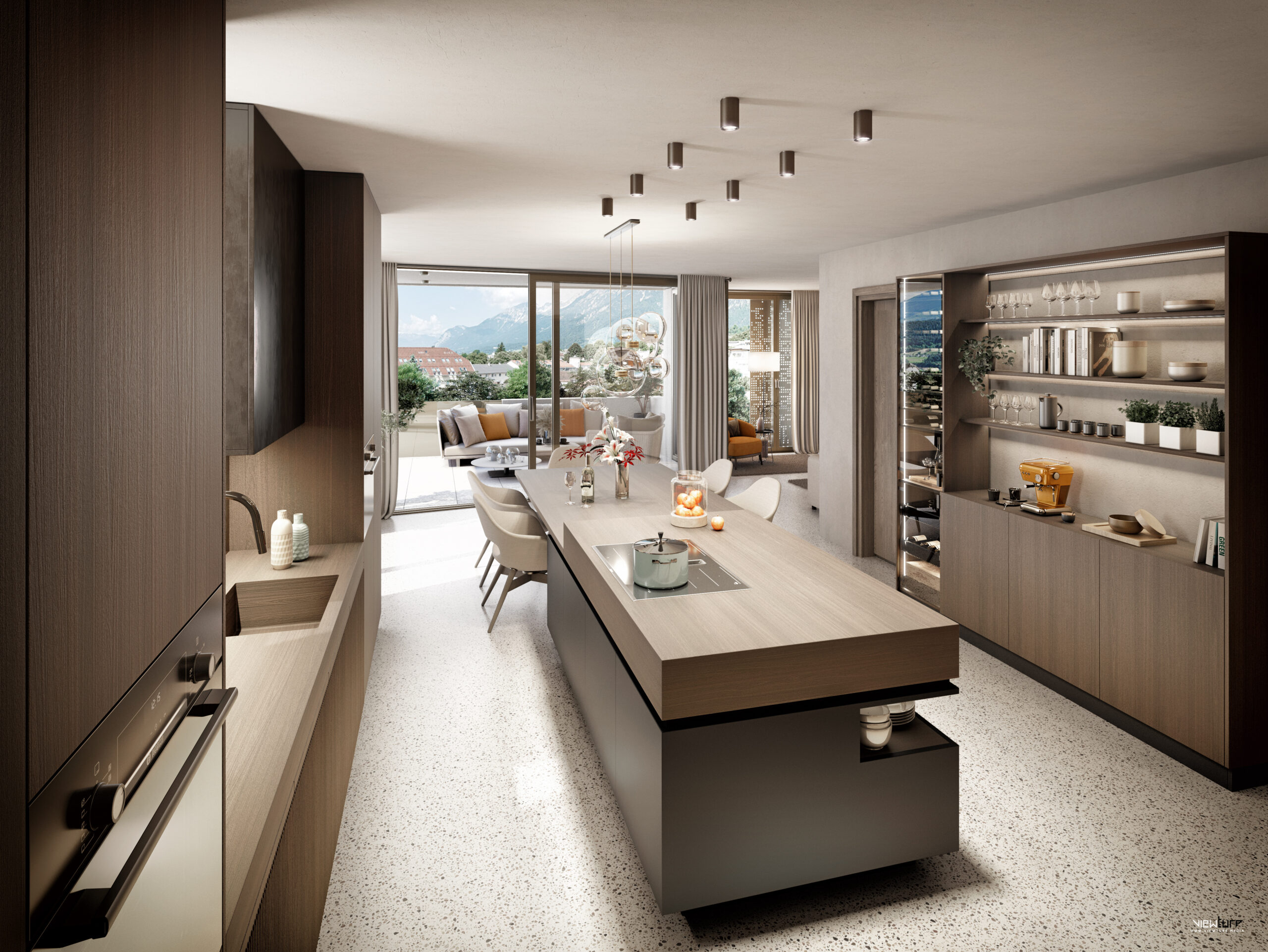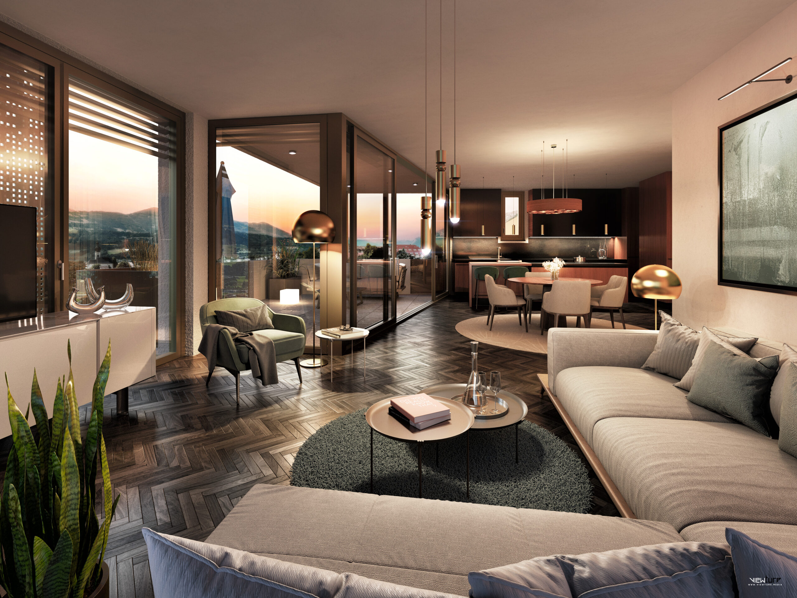 Alle Wohnungen verfügen über Terrassen oder Balkone, hochwertige Ausstattung, durchdachte Grundrisse und ein Höchstmaß an Privatsphäre. Holzparkett, Feinsteinzeug, energieeffiziente Wärmepumpe sowie Tiefgaragenplätze mit E-Ladevorbereitung unterstreichen den modernen Wohnstandard.