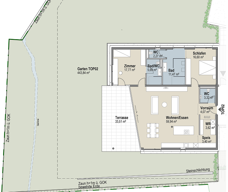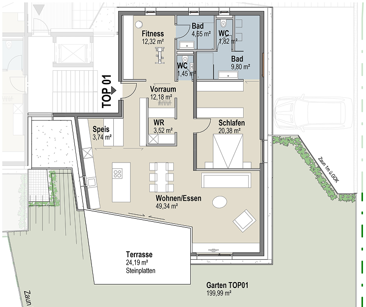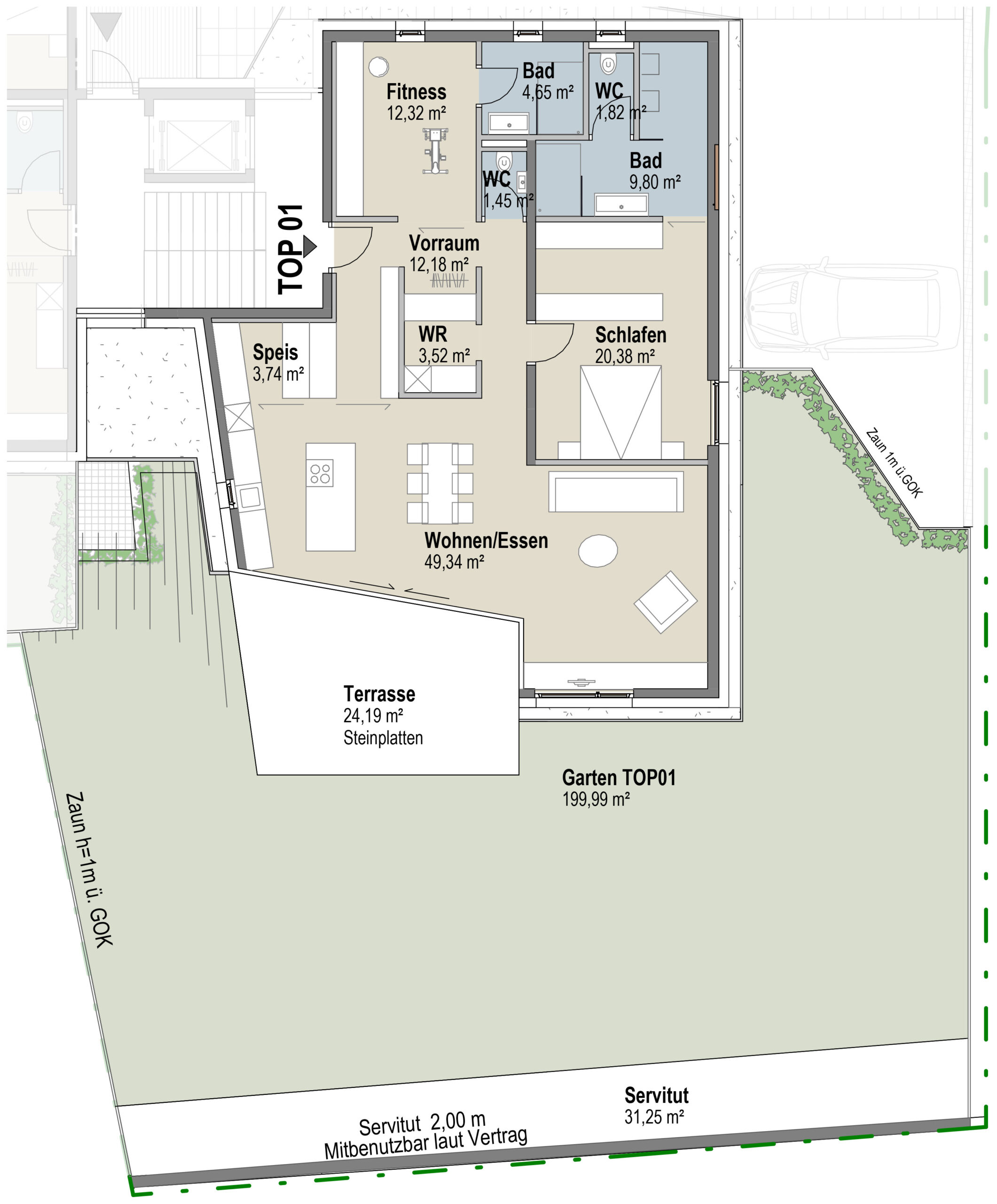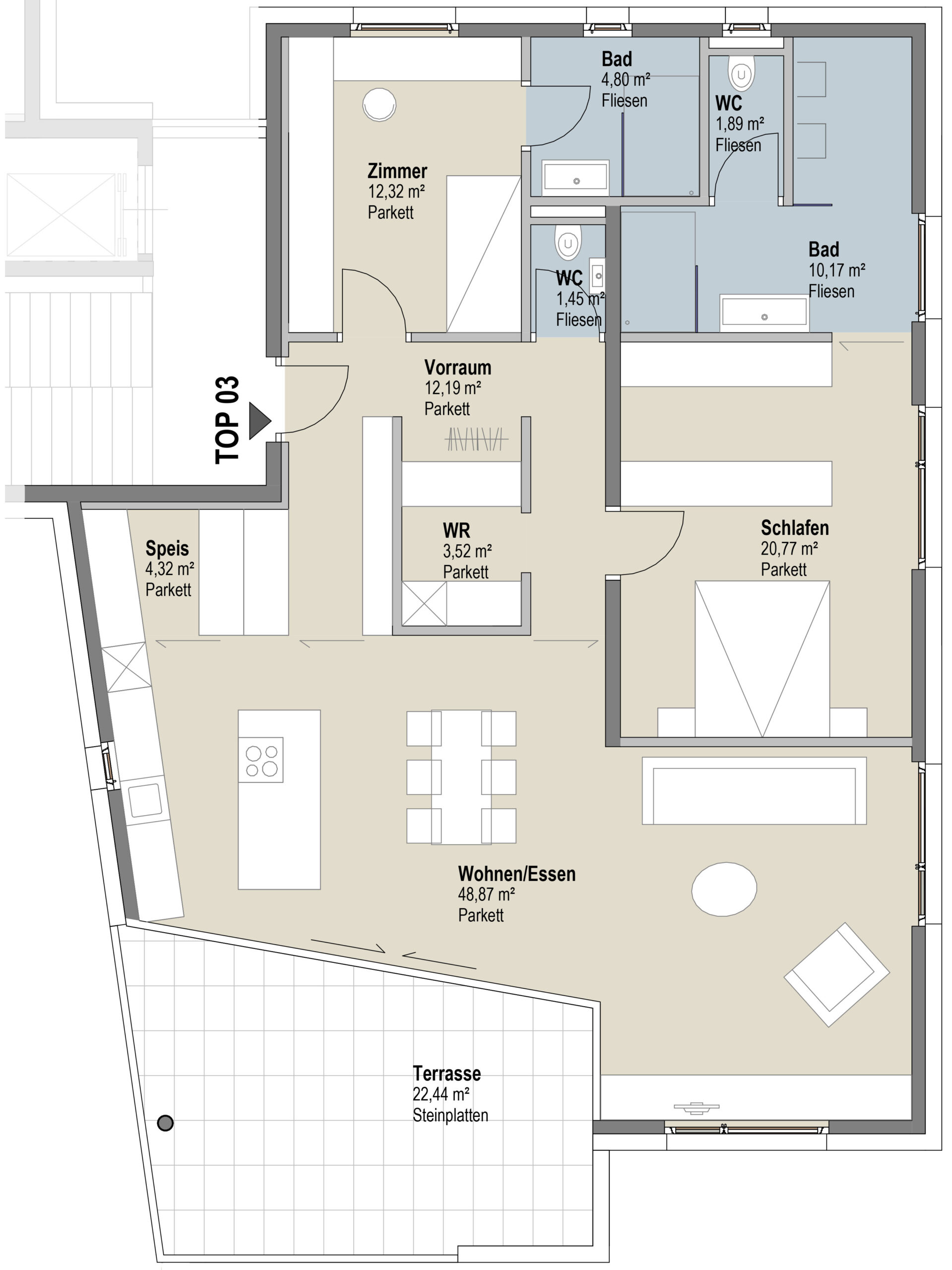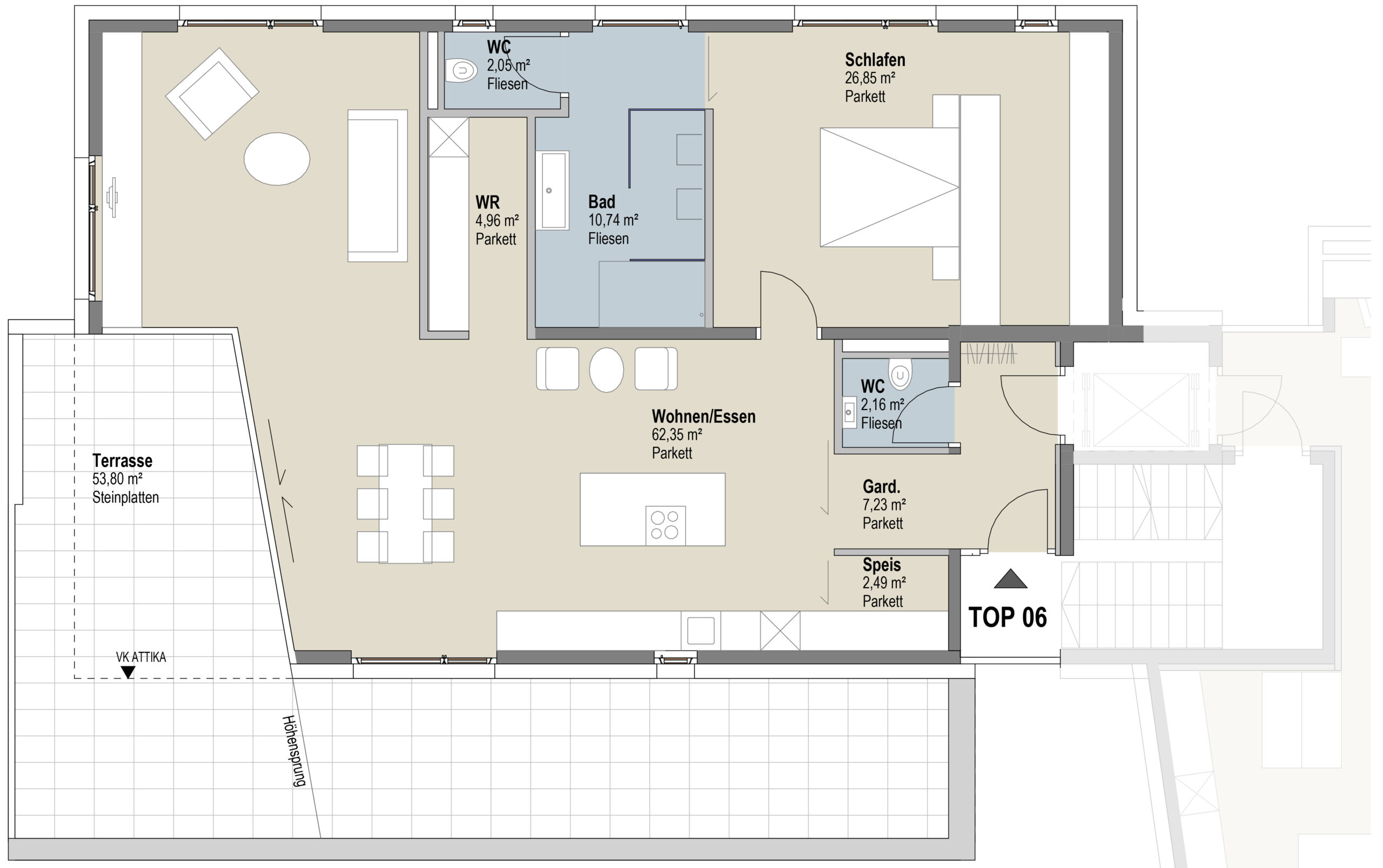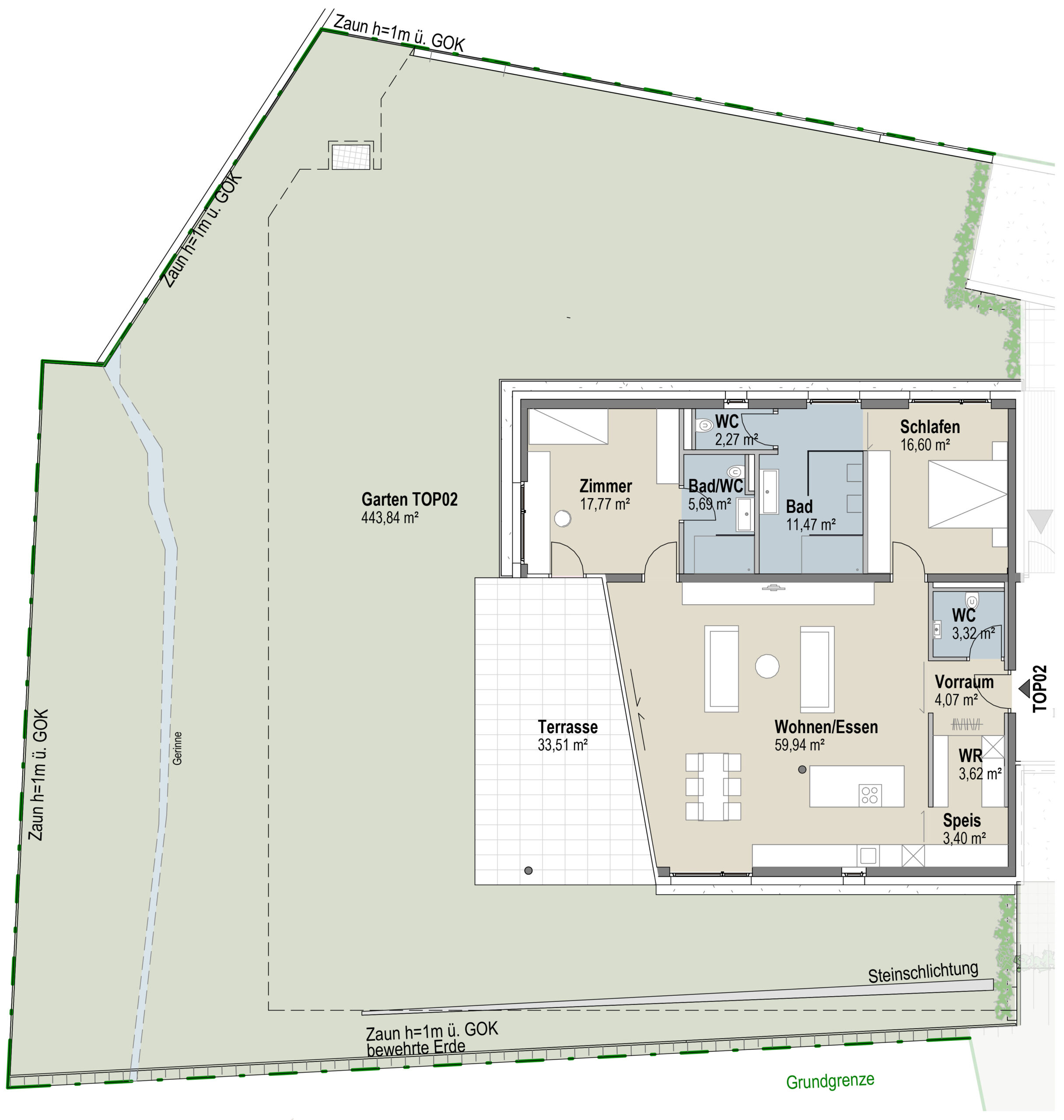 Alle Wohnungen verfügen über Terrassen oder Balkone, hochwertige Ausstattung, durchdachte Grundrisse und ein Höchstmaß an Privatsphäre. Holzparkett, Feinsteinzeug, energieeffiziente Wärmepumpe sowie Tiefgaragenplätze mit E-Ladevorbereitung unterstreichen den modernen Wohnstandard.
